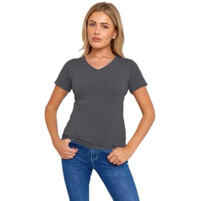 Women's Ladies Short Sleeve V Neck Basic Top Jersey Plain Stretchy Slim Fit Casual Wear T Shirt Tee Tops Charcoal 16 18