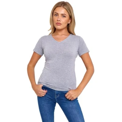 Women's Ladies Short Sleeve V Neck Basic Top Jersey Plain Stretchy Slim Fit Casual Wear T Shirt Tee Tops Grey 16 18