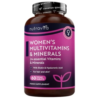 Convenient Daily Use & 2-Month Supply: This multivitamin for women / vitamins women comes in a pack of 60 vegan multivitamin tablets, designed for once-daily use. Simply take one tablet per day with water. The 60-day supply is suitable for those seeking reliable multivitamin tablets for women as part of their daily routine. This product is ideal for individuals looking for vitamins for women supporting at any age, including multi vitamins for over 60s and multi vitamins for women over 50 women multivitamins women vitamins . 24 Key Nutrients with Defined Dosage: Each multivitamin tablet includes a combination of 24 carefully selected ingredients: Vitamin A (800µg), Vitamin D3 (5µg), Vitamin E (12mg), Vitamin K1 (75µg), Vitamin C (80mg), Vitamin B1 (1.1mg), B2 (1.4mg), B6 (1.4mg), B12 (2.5µg), Folic Acid (200µg), Biotin (50µg), Niacin (16mg), Pantothenic Acid (6mg), Iron (14mg), Zinc (10mg), Selenium (55µg), Copper (1mg), Manganese (2mg), Chromium (40µg), Molybdenum (50µg), Iodine (150µg), Magnesium (60mg), Potassium (40mg), and Hyaluronic Acid (20mg). This formulation supports a comprehensive intake often included in female multivitamins and multivitamin with iron options. Clean Nutrition You Can Trust: Nutravita’s supplements are manufactured in certified facilities to meet the highest GMP and BRC quality standards. Each batch is rigorously tested for quality and safety. Free from artificial colours, preservatives, and unnecessary binders or fillers for daily use. Formulated by Nutritionists: Nutravita's products are developed with a team of in-house nutritionists to deliver trusted, effective formulations. We include ingredients with proven benefits to support your wellbeing every day. We are here for your daily support for a wide range of health goals. Nutravita - Your Health Matters. Trusted By Many, Made For You: Founded in the UK, Nutravita is a family-run brand trusted by thousands of customers since 2014. Our mission is simple: to provide quality, honest supplements that support a healthier lifestyle - backed by transparency, science and care.