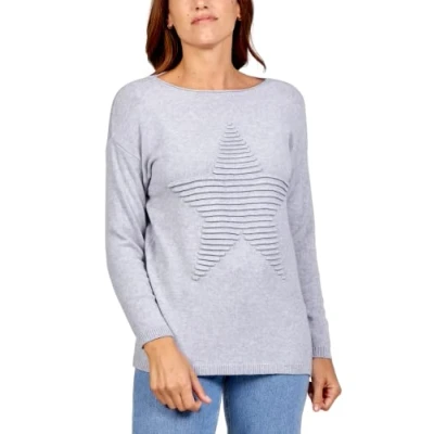 Women's Ribbed Star Jumper Casual Italian Lagenlook Stretchy Pullover Sweatshirt Ladies Crew Neck Long Sleeve Winter Soft Knit Cardigan Tops Grey