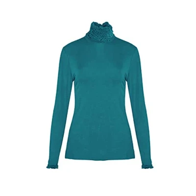 Women's Ruffles Frill High Neck Polo Top Ladies Long Sleeve Jumper Plain Basic Stretch T Shirt Casual Tops UK Size 8 10 12 14 (UK 8, Teal)