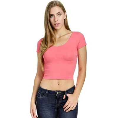 Women’s Short Cap Sleeve Crop Top Ladies Round Neck Cropped Vest T Shirt Mini Plain Printed Tops Coral 12 14