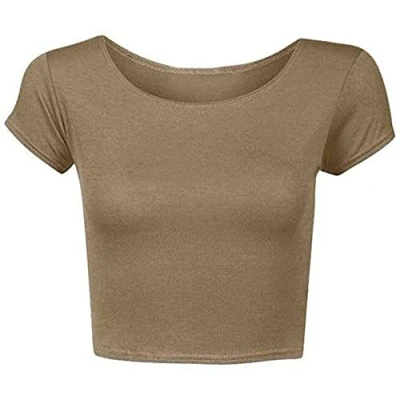 Women’s Short Cap Sleeve Crop Top Ladies Round Neck Cropped Vest T Shirt Mini Plain Printed Tops Mocha 12 14