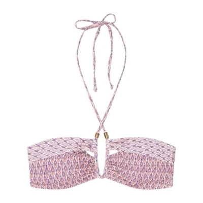 Bandeau bikini top with a boho print in shades of lilac. Removable cups and underwire. Pucker detail on the neckline and an adjustable tie with beads at the neck.