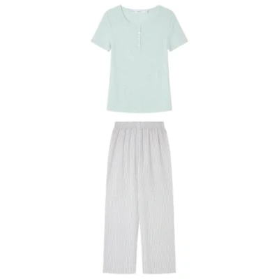 Soft viscose short sleeve and long pant pajama set with solid rib top and striped print pants Ideal for being at home super comfortable and stylish