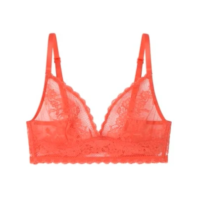 Triangle bra with plunge neckline made in delicate leaf lace With a wide underband and thinner back strap Thin adjustable straps