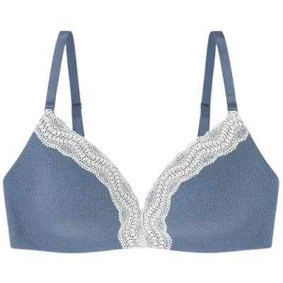 ChARMING triangle bra with low neckline, made in ribbed cotton in light blue with delicate white lace detail. Padded, nonwired. When you buy our cotton products, you're supporting our investment in the Better Cotton Initiative. Design adapted to size for the best fit and comfort: Thin adjustable straps in size 90C. Wide straps with formfitting back from size 95C90D.