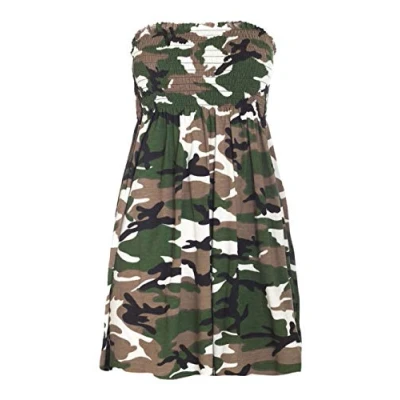 Women Strapless Sheering Top Printed Bandeau Boob Tube Sleeveless Vest Ruched Gather Sharing Mini Dress Army Khaki UK 12 14