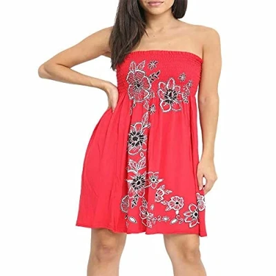 Women Strapless Sheering Top Printed Bandeau Boob Tube Sleeveless Vest Ruched Gather Sharing Mini Dress Red UK 20 22