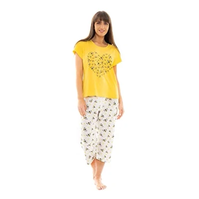 Womens 100% Cotton Jersey Short Sleeved Cropped Leg Animal, Butterfly, Bear & Heart Design Pyjamas (16 18, BEE)