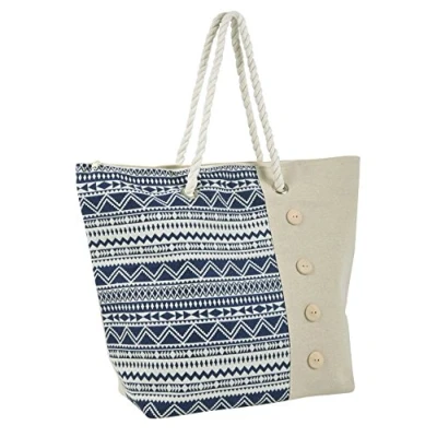 AmazonCanvas feel beach bag with zip closure Blue aztec pattern with 4 wooden buttons Cotton rope handles Fully lined interior with zip pocket for your phone & cash Measures 50 x 38 x 16cm approx.