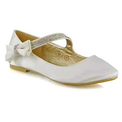 Stunning Womens Foot Strap Diamante Bow Round Toe Flat Pumps This Style Is Perfect For Special Events Such As Weddings, Bridesmaid, Bridal, Flower Girl & Prom! Heel Height 1 CM / 0.4 Inches Made With Satin & Synthetic High Quality Materials Available In Black, Pink, Ivory, Silver, White & Pink