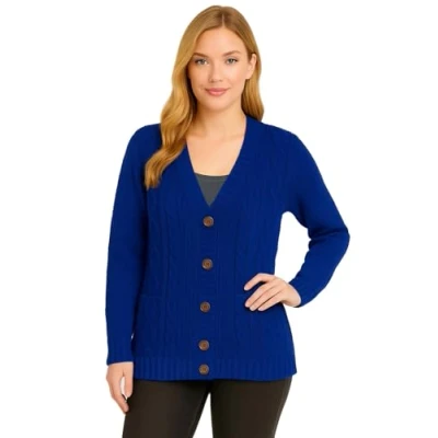 Womens Chunky Cable Knitted Ladies Boyfriend Grandad Pocket Button Top Cardigan, (M/L 12 14, Royal Blue)