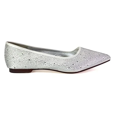 Womens Flat Diamante Shoes Ladies Wedding Slip On Point Toe Ballet Pumps White Satin
