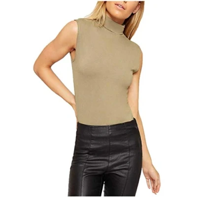 Womens High Roll Polo Turtle Neck Top Sleeveless Ladies Basics Stretch Summer Shirt Vest Mocha, 16 18