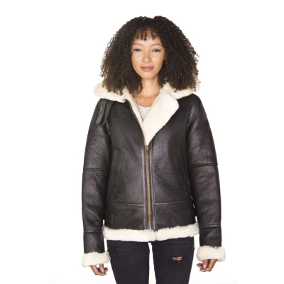 Womens Hooded Sheepskin Jacket B3 Flying Leather RAF Aviator Pilot Brown Cream L