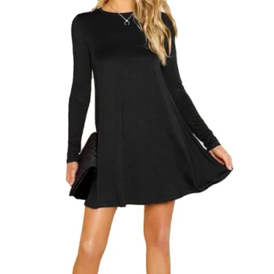 Womens Ladies Party Dresses for Women UK Long Sleeve Midi Plain Flared A line Skater Swing Dress Jersey Tee Plus Size Summer Winter Black 16 18