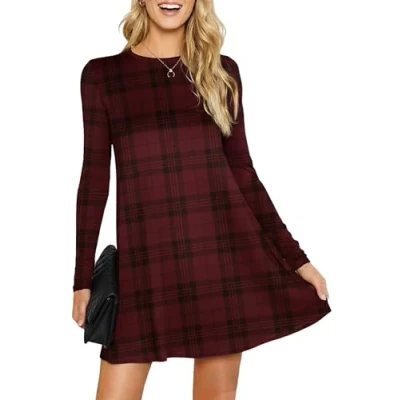 Womens Ladies Party Dresses for Women UK Long Sleeve Midi Plain Flared A line Skater Swing Dress Jersey Tee Plus Size Summer Winter Burgundy Wine Tartan 20 22
