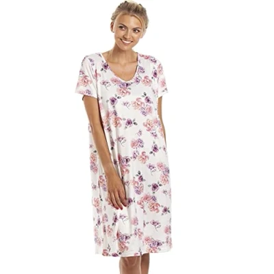 LIGHTWEIGHT & COOL - Made with soft, breathable fabric, this knee-length ladies' nightdress ensures comfort during warm nights, keeping you cool and relaxed while sleeping or lounging. PRETTY FLORAL PRINT – Designed with delicate floral patterns, our women's nighties add a stylish, feminine touch to your women's nightwear. Available in cream, navy or light blue. FLATTERING V-NECK & RELAXED FIT - Featuring a gentle V-neckline and loose-fitting silhouette, these short-sleeved ladies' nighties offer a comfortable fit for a restful night’s sleep. EASY CARE - Made with soft and machine washable easy-care fabric, our womens pyjamas offer hassle-free care, keeping this button-down nightdress fresh and clean with minimal effort. UK FAMILY BUSINESS - Camille is a family-owned specialist retailer of women's nightdresses & nightshirts, lingerie and all other women's nightwear based in Derby, UK. Now, over 20 years since our creation, our focus has always been to provide a blend of classic quality and feminine style at sensible prices.