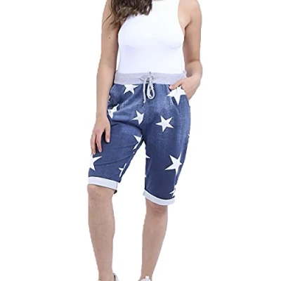 Womens New Italian Printed Shorts Elastic Waist 3/4 Cropped Trousers Summer Beach Pants Magic Short Pajamas Dark Denim Star 16 18