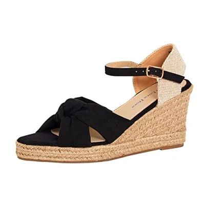 Womens Open Toe Wedge Sandals Espadrille Wedges Strappy Hessian Ankle Wrap Shoes Black UK 3