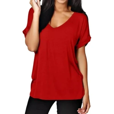 Womens Oversize Fit V Neck Top Ladies Baggy Plus Size Batwing Casual T Shirt sizes 8 24 (XL UK 16 18, Red)