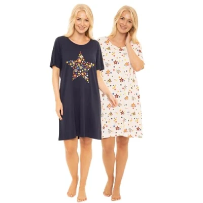 Womens Pack of 2 Short Sleeved 100% Cotton Jersey Nightshirts. Butterfly, Heart, Stag, Bee, Campervan Print Designs (RAINBOW STAR, 12 14)