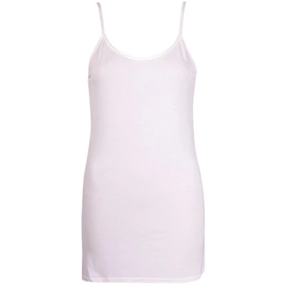 New womens strappy vest. Sleeveless with a round scoop neckline. Slim shoulder straps. Soft stretch fabric. Length shoulder to hem 33 inches.