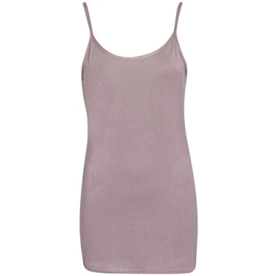 New womens strappy vest. Sleeveless with a round scoop neckline. Slim shoulder straps. Soft stretch fabric. Length shoulder to hem 33 inches.