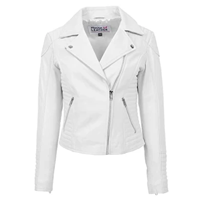 Womens Real Leather Biker Jacket Cross Zip Slim Fit Style Anna (10, White)