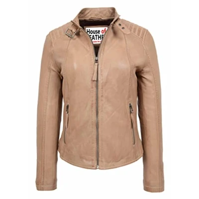 Womens Real Leather Classic Biker Style Jacket Sophia (12, Beige)