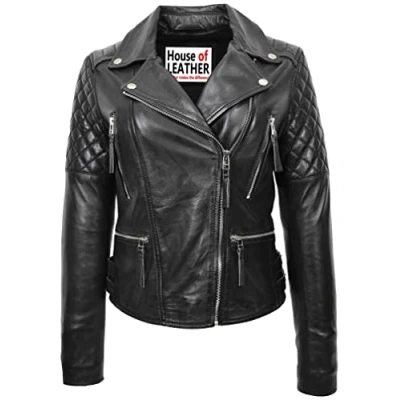 Womens Real Leather Cross Zip Biker Style Jacket Claudia (18, Black)