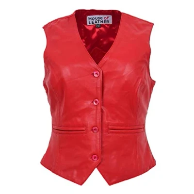 Womens Real Leather Waistcoat Button Fastening Traditional Style Rita (10, Red)