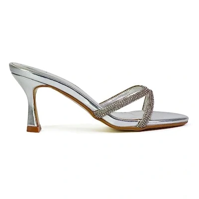 Womens Slip On Mule Heeled Sandals Ladies Stiletto Strappy Diamante Party Silver Shoes Size 3