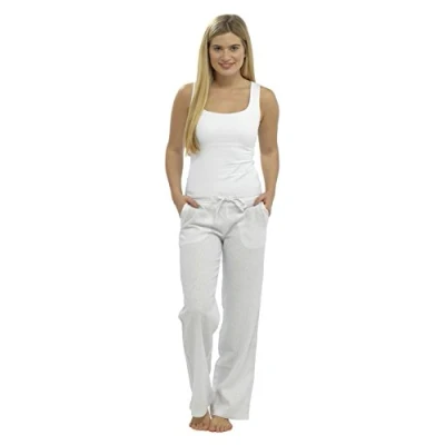 Womens Solid Colour Elasticated Waist Linen Trouser Bottoms Pants White 10