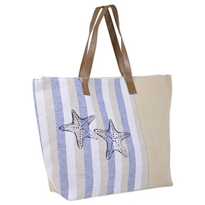 AmazonCanvas feel beach bag with zip closure Blue Starfish and vertical stripes Brown faux leather handles Fully lined interior with zip pocket for your phone & cash Measures 50 x 38 x 16cm approx.