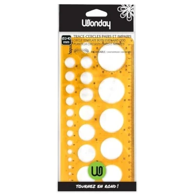 Unbreakable Circle Trace 27 circles: from 2 to 40 mm Ø even and odd Dimensions : 22 x 10.5 cm Soft plastic with stain-resistant system graduated in mm / cm on one side