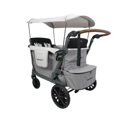 Why Buy Me? The Wonderfold L4 Quad Stroller Wagon is designed to make life easier for families with four children. With its spacious interior, it comfortably accommodates four little ones, while the adjustable faux leather handlebar and 360° swivel front wheels with a locking option ensure smooth rides on any surface. Equipped with 5-point harnesses, a one-step foot brake, and a UPF 50 canopy, it offers maximum safety and protection. The side-entry door allows easy access, while removable seats and generous storage space give parents complete flexibility. Stylish yet practical, it brings comfort and convenience to every family outing — from city strolls to outdoor adventures. Brand: Wonderfold Product Type: Pushchairs & Prams Product Sub-type: Wagon Stroller Age: 6+ months Details: • Capacity: Designed for up to four children, offering a spacious interior for comfortable rides. - Weight Capacity: 214.3 lbs. (97.2 kg) - Bench Weight Limit: 100 lbs. (45.36 kg) per bench • Seats: Includes two removable and adjustable bench seats; can be converted into a utility wagon when seats are removed. • Safety: Features 5-point harnesses for each child and a one-step foot brake for maximum security. • Wheels: 360° swivel front wheels with a locking option ensure smooth navigation on any terrain. • Canopy: Adjustable poles with UPF 50 protection provide shade from the sun and wind. • Handlebar: Adjustable faux leather handlebar with a wrist strap offers safe and comfortable handling for parents. • Easy Access: Side-entry door allows children to hop in and out effortlessly. • Storage Space: Pockets on both sides, front pocket, and a detachable rear basket provide ample storage for essentials. • Material: Durable aluminium frame combined with breathable mesh side panels. • Protection: Mesh panels feature roll-down shades for wind and privacy protection. • Foldability: Easily folds with one motion and stands upright for convenient storage. • Care: Fabric sections can be cleaned with mild soap and warm water. • Certifications: Complies with ASTM F833-21 safety standards and is free from BPA and PFAS. Dimensions: • Open Dimensions: 135 cm (L) x 79 cm (W) x 82.5–105.5 cm (H) • Folded Dimensions: 75 cm (L) x 64 cm (W) x 103 cm (H) • Inner Carriage: 89 cm (L) x 57.5 cm (W) x 44.5 cm (H) • Seat Height (from ground): 25.5 cm (H) • Wagon Weight: 42.28 lbs. (19.18 kg) • Bench Weight: 4.94 lbs. (2.24 kg) per bench • Wagon Weight with Single Bench: 47.22 lbs. (21.42 kg) • Wagon Weight with Both Benches: 52.16 lbs. (23.66 kg)
