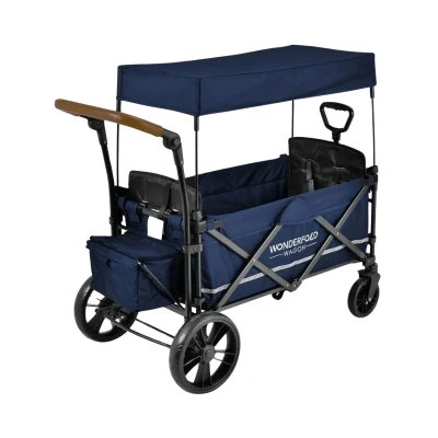 AmazonPERFECT COLLAPSIBLE WAGON – Folds easily and holds up to 2 passengers with five-point adjustable safety harnesses to keep the little ones secure REMOVABLE CANOPY – Removable UV-protection wagon canopy provides shade for little ones while they ride in the carriage ADJUSTABLE PUSH HANDLE – Allows you to set the handle position to accommodate your needs TELESCOPIC PULL HANDLE – Designed for customization to fit your needs, and the spring bounce technology prevents the handle from falling to the ground when released REMOVABLE FABRIC FOR EASY CLEANING – Keep your baby stroller tidy with the conveniently designed, removable fabric liner that can be washed with mild soap and warm water