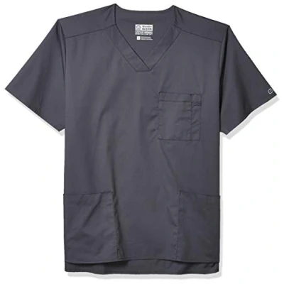 Men's multi pocket top 360 degree motion stretch flexible fit fabric Two large front patch pockets One double chest pocket with utility loop and 1 inch longer back length Vented side seam at hem, 31 inch back length size M and bungee loop badge holder