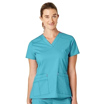 WonderWink "Lady" Fit darted V-Neck Top Two lower tilted pockets, including 1 WonderWink signature triple pocket Two front body darts for superior shaping Triple-needle stitching at the dropped shoulder WonderFLEX LE Badge above left pocket corner, Side vents for ease of movement, Available in S-5L, 52% Cotton / 45% Polyester / 3% Spandex, 27 1/4 Inch Back Length (Size MD)