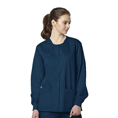 Unisex snap front jacket 360 degree motion stretch flexible fit fabric Two large front patch pockets with pen and cell phone pocket Soft rib knit cuffs 29 inch back length size small, bar tacks and heavy thread stitching at stress points, bungee loop badge holder wearers right shoulder
