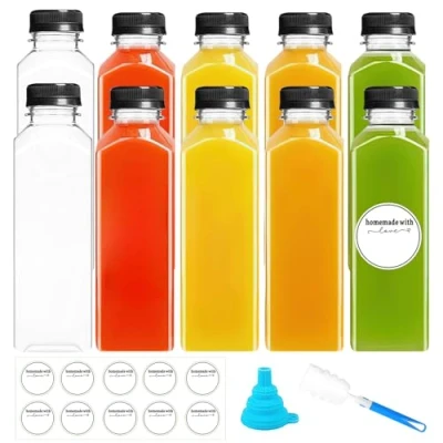 Juice Bottles Pack Includes: Contains 10 transparent 400ml plastic juice bottles, 1 cleaning brush, 1 filling funnel, and 10 convenient reusable label stickers. Secure Seal Design: Features tamper-evident lids designed to help prevent leaks and indicate if the bottle has been opened, assisting in maintaining contents' freshness. Clear Visibility & Labelling: Transparent design allows easy identification of contents. The included stickers enable clear labelling when carrying multiple different drinks. Easy to Use and Clean: Supplied with a bottle brush for effortless cleaning and a funnel for simple filling, facilitating convenient drink preparation and portability. Versatile and Portable: Lightweight design makes these bottles ideal for carrying on the go. Suitable for storing juice, smoothies, milk, milkshakes, iced coffee, fresh juice, water, and various other homemade beverages., Manufacturer: Woobroo