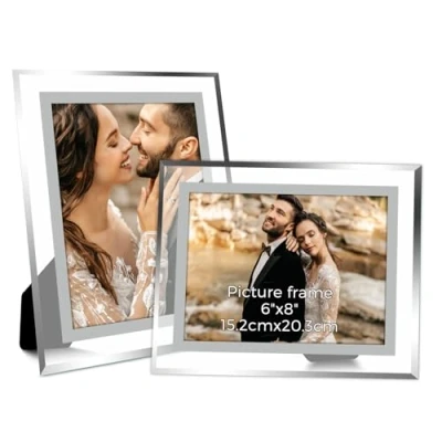 Silver Photo Frames: With an inner size of 15x20cm and outer size of 20x25cm, the frame strikes a balance between visibility and space-saving. It supports both horizontal and vertical placement on tabletops, idear for matching different decor styles and photo orientations without taking up too much room.Please note: Hand-measured dimensions may vary by 1-2cm. Premium Glass Material & Clear Display: Crafted from quality glass with fine laser cutting and polishing, the frame features a silver double-edge design that delivers a crystal-like shine. Its high transparency showcases every photo detail vividly, while the smooth, scratch-resistant surface keeps photos looking sharp with a sleek, refined touch. Easy Photo Insertion & Replacement: Features a user-friendly semi-circular opening that lets you insert or swap photos, certificates, or artworks effortlessly. No tools are needed, making it simple to update cherished memories anytime with zero hassle. Elegant Silver-Edge Style for Various Scenarios: The timeless silver double-edge look complements home, office, or event decor seamlessly. It adds warmth to spaces while highlighting precious moments, fitting daily display, weddings, family gatherings, or holiday setups with a subtle, stylish vibe. Thoughtful Gift for Loved Ones: Coming in a set of 2, this frame makes a heartfelt present for birthdays, Christmas, anniversaries, or weddings. It helps loved ones preserve special moments, turning ordinary days into memorable keepsakes that carry sweet emotional value.