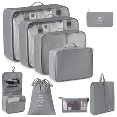 This value set of travel packing cubes includes 3 mesh-top clothing cubes, 1 drawstring pouch, 1 underwear bag, 1 flat pocket, 1 shoe bag, 1 wash bag and 1 cosmetic mesh bag for complete organisation Features waterproof material, dual zippers, breathable mesh panels and carrying handles for added convenience and durability during travels Space-saving compression design maximises luggage capacity while reducing bulk, creating extra room for essentials without overpacking Transparent mesh panels and easy-access zippers facilitate smooth security checks at airports, allowing quick item identification without unpacking Ultra-lightweight and foldable design with carrying handles enables easy storage in backpacks or handbags. Ideal for business trips, family holidays, skiing and camping, Weight: 1.322773572 pounds, Manufacturer: Woobroo
