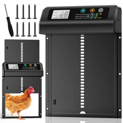 🛖【Smart Scheduling & Anti-Pinch Protection】Say goodbye to early mornings and late-night checks! Our automatic chicken coop door lets you set precise open/close times with just a few taps. Whether you're managing a backyard flock or a small farm, the dual-mode system (Timer/Manual) adapts to your routine. Plus, the automatic chicken door feature anti-pinch sensor automatically stops the door if an obstruction is detected—keeping your chickens safe from harm while you stay worry-free! 🐓【All-Season Temperature Control】Keep your chickens comfortable year-round, no matter the climate! With support for temperature control between -20℃ and 50℃, this chicken coop door automatic opener helps you manage internal chicken house conditions during extreme winter frost or intense summer heat. Whether you raise hens in snowy regions or humid zones, this automatic chicken coop door is built to handle it—all and giving your birds the stable environment they need to thrive! 📱【Angled Screen Desgin & IPX6 Weatherproof】Our automatic chicken doors feature a tilted LCD screen for easy viewing, even when mounted at a low height. The angled design also helps the tilting design helps rainwater run off quickly, always keeping the display clear and readable. Additionally, this chicken coop door automatic opener feature IPX6 waterproof design, allowing it to operate reliably in heavy rain and humid environments, perfect for all your outdoor needs! 🦆【Quality Materials & Quiet Operation】Unlike other products, our automatic chicken coop door is built with high-strength aluminum alloy that resists rust, warping, and wear-even in tough outdoor conditions. Plus, Our chicken house coop door operates at under 60 decibels, ensuring a quiet environment that won’t startle your chickens. With durable construction and whisper-quiet performance, it’s a long-lasting, worry-free solution for your free-range flock! 🥇【Ultra-Long Battery Life】Tired of constantly changing batteries? Our newly upgraded automatic chicken coop door opener features an energy-efficient system that runs for up to 300 days on a single charge (batteries not included). Whether you're away on holiday or simply want fewer maintenance tasks for the chicken coop, you can rely on it to work consistently without the need for frequent checks or battery replacements!