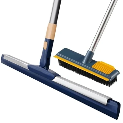 Multi Occasion Use: According to the design of human mechanics, the floor cleaning brush and floors are designed at a 45 degree labor-saving angle. Wet or Dry use, the cleaner brush tool can be widely used in tile floor, hardwood floor, glass surface and cement floor like tub, bathroom, kitchen, shower, wall, garage and patio. Floor Scrub Brush 2 in 1 Scrape&brush Push Broom Effective, Easy & Save Effort Brush + scraper 2 in 1 design floor scrub brush with stiff bristle + rubber squeegee; Strong cleaning ability; Brush + scrape steps to easily remove the stain, stubborn grime, dirty water, and dust; Improve effectiveness when you doing housework. Robust and durable:The floor scrubbing brush is made of hard PVC bristles, soft rubber scrapers and stainless steel handles. The hard bristles are easy to remove stains and are not easy to deform. There is also a hanging hole on the top of the handle, which can be hung for storage. The brush head is 23cm long, suitable for large area cleaning. The 45 degree angle between the brush and the handle is ergonomically designed, which is very labor-saving and easy to clean the corner. The extra long handle reduces knee or back bending. Floor Squeegee Broom MULTIPURPOSE: To dry floor surface efficiently and remove dirt and hair easily.Suitable for garage courtyard shower bathroom pet hair fur floor marble glass tile water foam cleaning
