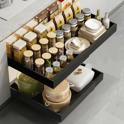 Durable Pull Out Cabinet Organiser: Constructed from heavy-duty carbon steel for smooth operation and robust structure. Additional tracks at the base enhance load-bearing capacity and stability for reliable performance Adjustable Width Design: Expands from 32 to 52 cm to fit various spaces. With a depth of 42 cm and height of 7.5 cm, this sleek organiser is ideal for kitchen, bathroom, or bedroom storage Multiple Fixing Options: Can be installed with screws or adhesive strips, offering flexibility based on user preference and cabinet type for a secure fit Smooth Slide-Out Mechanism: Allows full access to items without bending or struggling. Easily retrieve spice jars, cans and bottles while saving time and effort Large Storage Capacity: Compact yet spacious interior efficiently organises items of various sizes, keeping your kitchen tidy and clutter-free, Weight: 5.070632026 pounds, Manufacturer: Woobroo
