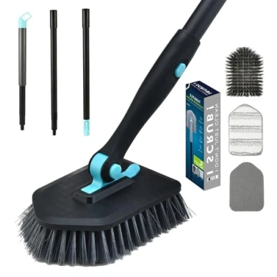 The shower scrubber brush for cleaning is a great bathroom cleaning supplies for cleaning bathroom tiles, bathtub, glass, floors, walls,window, door, sink, mirror,countertop, ceiling and narrow spaces around the toilet and is also a great commercial cleaning tools for cleaning public toilets and hotels The shower cleaning brush as a professional bathroom cleaning supplies with three different function heads: One stiff bristle brush for cleaning tile floor and wall, two scouring pad with more scraping force for cleaning bathtub,tub, one microfiber pad with gentle scouring for cleaning mirror ,glass and window Multifunctional scrub brushes for cleaning: It can be used not only as a tub scrubber or bathtub scrubber for bathroom cleaning, floor scrub brush for tile floor cleaning, but also as a duster for cleaning cars and kitchen Scrub brush with long handle: Extendable long handle can be adjusted from 45” to 56”. The lower rod is made of stainless steel and not easy to rust This telescopic pole is detachable, and the brush head can be used as a hand-hold brush or duster separately. Handle of the top brush head about 6.8" which is perfect for hand holding