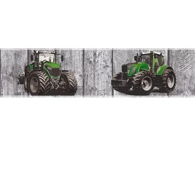 A child's border, with grey wood effect background and bold green coloured tractors with a light texture. Shown in the Grey colourway. Paste the paper. Pattern repeats every 53 cm.